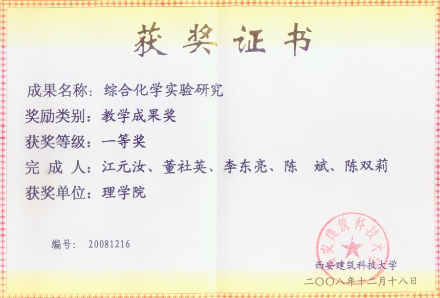 江元汝等荣获2008年度校教学成果奖一等奖-西安建筑科技大学化学实验教学中心