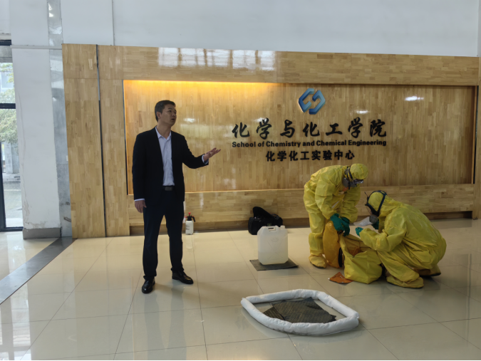 为进一步强化师生安全意识,提升实验室突发事件的应急处置能力,10月16日下午,化学与化工学院在学府城1号楼化学化工实验中心成功举办实验室安全应急演练。学校草堂校区管委会主任张振龙、学院党委书记张卫华、实验室与设备管理处副处长于乐兵等领导出席活动,研究生辅导员、教学办和实验中心全体教师以及全体研究生参与演练。本次演练特邀西安安备思软件有限公司总经理刘涛做总指挥,演练由副院长王耀主持。