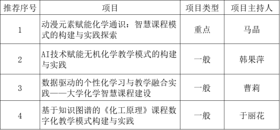 根据《关于开展2025年度校级教育教学改革研究项目立项工作的通知》(西建大本科〔2025〕40号)文件要求,经各系、实验中心老师申报,院外专家评审,2025年度校级教育教学改革研究项目化学与化工学院推荐结果如下。