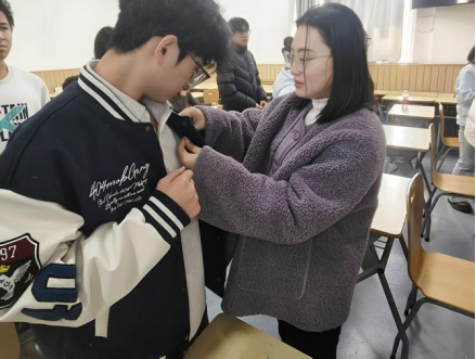 院团委组织部部长杨珍宣读新团员名单。院团委委员为新团员佩戴团徽、颁发团员证。院团委宣传部副部长许嘉禄带领新团员宣誓。